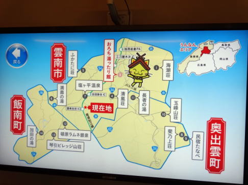 | 駅構内に設置してある電光掲示板によると、どうやら魅力的な温泉が点在しているような。この松江自動車道は無料区間のため 乗り降りしやすいのがいい。次回は温泉地巡りにチャレンジしたいな。そばも他に食べてみたいメニューがいろいろあるし・・・。 |