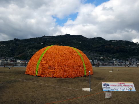 | 八幡浜港に隣接する道の駅「八幡浜みなっと」の広場に、みかんオブジェが展示されたとニュースで流れていたので見に行ってみた。 上の写真で見ると、こぢんまり見えるが近くで見ると結構デカイ!それもそのはず、本物のみかん約18,000個を使っているらしい。私が訪れたのは昼間だったが、22時までライトアップされているようなので夜のみかんボール(?)もまた違った印象があるかも・・・。 |