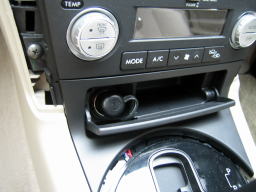 | そうしたらシガーソケットアッシーが手前に引き出せるので両側の爪を外しつつ引っ張る。 最初にシフトレバーをニュートラル位置にしたのは、Pのままだとここで干渉するから。 元の配線までは外す必要なし。ここからセンターコンソール内に挿入して奥まで入れる。 |