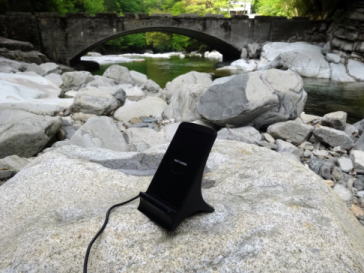 | 5月の連休といえども面河渓は寒かった。渓泉亭パワーで充電できるかと思ったが、岩にはUSBポートが 見当たらず断念(^O^) でもご心配なく。自宅では背面カバーを装着していても、問題なくワイヤレス充電が出来た。 |